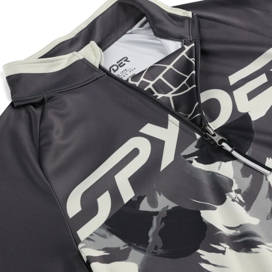 This stretch polyester t-neck is an ideal moisture-wicking layer while out on the mountain.nStretch Polyester Interlock UPF 50+nYKK® Front half zippernCustom seasonal spyder graphicsnCB Length: Size M: 21 1/2″nFit: Fittedn100% POLYESTER