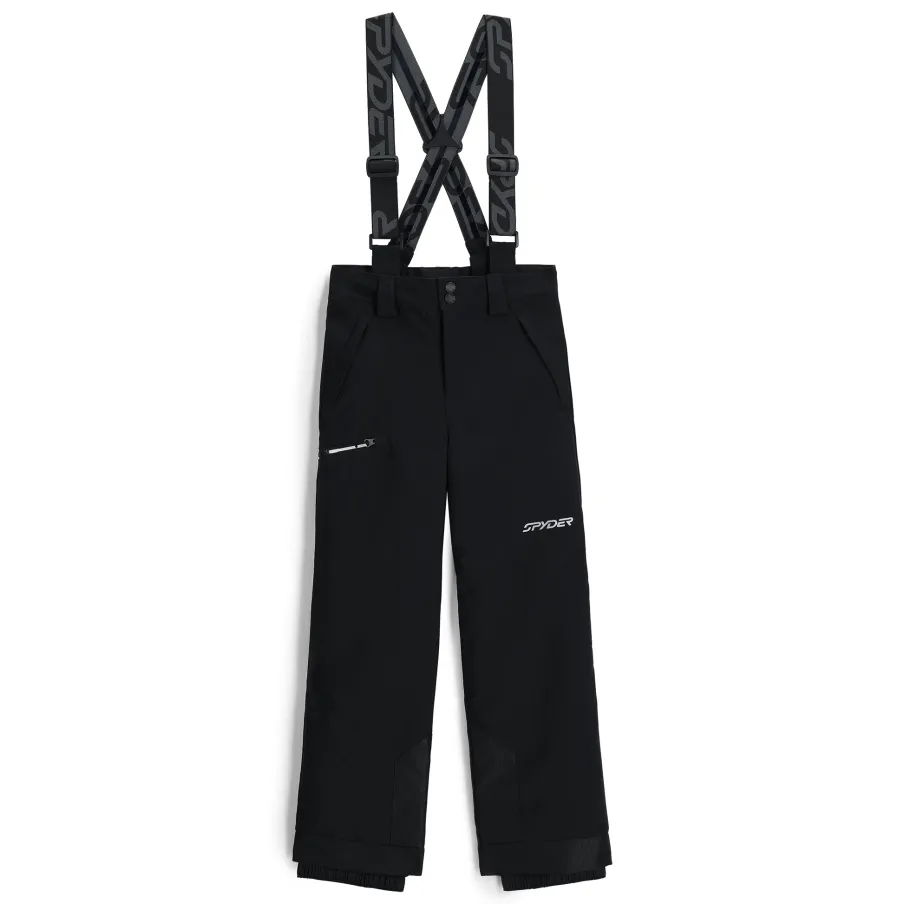 High-performing features and the full array of colors let you match the Propulsion pants with any Spyder jacket. The YKK® thigh pocket zipper, inner snow gaiters with gripper elastic and reinforced scuff cuffs and removable, adjustable suspenders help ensure staying warm and dry on the mountain or in the backyard on a snow day. EXO SHIELD 10K/10K recycled fabric and EXO THERMO insulation (60g) ensure you stay warm and dry on the mountain.nEXO SHIELD 10K – Stretch Recycled Polyester Plain Weave with 10K/10K Laminate and DWRnEXO THERMO Insulation (60G)nComponents are produced without PFAS chemicalsnRemovable adjustable suspendersnInternal adjustable waist construction and belt loopnYKK® Vislon® thigh pocket zippernYKK® Zippered hand pocketsnReinforced scuff cuff around bottom hemnInner snow gaiters with gripper elasticnSmall to Tall hem extends an additional 2″ when stitch is releasednInseam Length Size 10: 25″nFit: Standardn55% RECYCLED POLYESTER / 45% POLYESTER