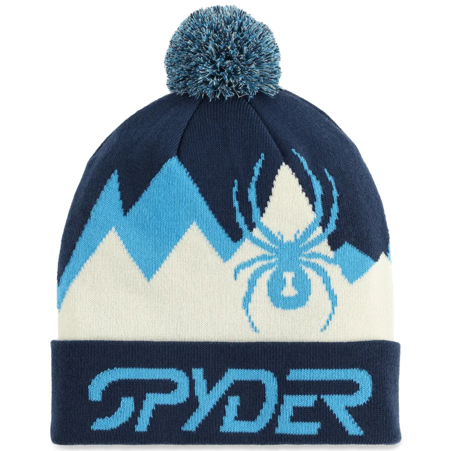 A rolled cuff, multicolored pom, and mountainous graphic make this 100% recycled polyester yarn hat an edgy, yet classic Spyder piece.n100% Recycled Polyester YarnnRolled cuffnMulti-Colored Pomn100% RECYCLED POLYESTER