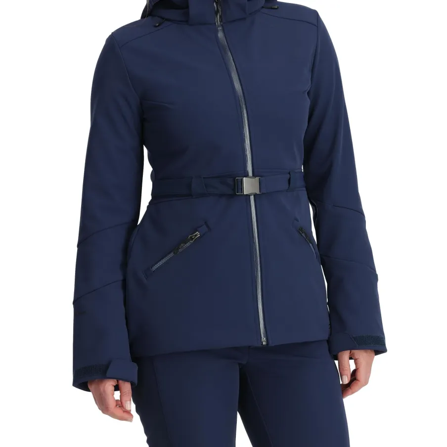 Experience winter in a new light with this chic jacket crafted from Stretch Nylon Softshell, featuring a 10K/10K Laminate and DWR for optimal flexibility and weather resistance. The Glacial Softshell is your stylish companion for any mountain environment. The YKK® AquaGuard® center front zipper adds a touch of sophistication and provides excellent weather protection. Elevate your look with the YKK® Vislon® AquaGuard® hand pocket zippers, combining functionality with a hint of flair. Functional outerwear meets refined style with the removable belt, allowing you to customize the waistband for the perfect fit. Keep your essentials secure in the internal zippered pocket. Step onto the slopes with confidence and style in the Glacial Softshell Jacket – where fashion, function, and feminine allure converge seamlessly.nEXO SHIELD 10K – Stretch Nylon Softshell with 10K/10K Laminate and DWRnComponents are produced without PFAS chemicalsnRemovable hood with adjustable opening fits over most helmetsnYKK® AquaGuard® center front zippernYKK® Vislon® AquaGuard® hand pocket zippersnRemovable belt with waistband adjustmentnYKK® CONCEAL® zippered data card pocket on sleevenInternal zippered pocketnAdjustable cuff tabs with interior stretch cuffs and thumbholesnCB Length: Size 8: 27.5″nFit: Standardn88% NYLON (POLYAMIDE) / 12% ELASTANE
