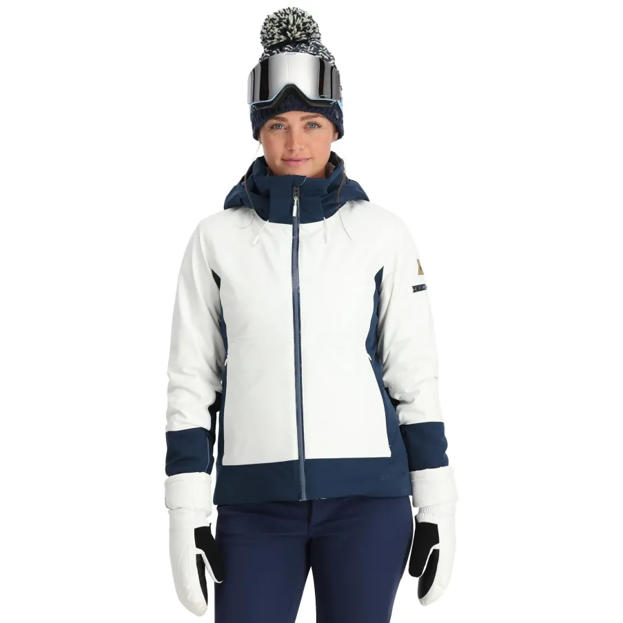 The Soleil brings a clean, sporty new design to the Spyder line this year. Made for the woman who doesn’t want her jacket to hold her back on the mountain, the Soleil’s targeted 4-way stretch paneling and 30K/20K waterproof breathability make this jacket stand out from the competition. Zippered sleeve gussets, interior stretch cuffs, and thumbholes ensure your sleeves stay securely in place, preventing snow from sneaking between your glove and jacket cuff. Whether you’re rocking pink or blue to stand out or keeping a low profile in the black or white colorways, Soleil’s simple, refined color blocking will surely bring your whole ski kit together seamlessly!nEXO SHIELD 30K – 4-way Stretch Recycled Polyester Plain Weave with 30K/20K Laminate and DWRnPrimaLoft® Silver ECO Insulation (80g)nComponents are produced without PFAS chemicalsnAll seams sealednRemovable hood with adjustable opening fits over most helmetsnYKK® AquaGuard® center front zippernYKK® AquaGuard® sleeve pocket zippernYKK® Invisible hand pocket zippersnSilver Chassis: Targeted interior stretch panels, removable powder skirt with snap-back feature, spacer mesh padding at shoulders, internal zippered pocket, mesh goggle pocket, and chamois lens wipenUnderarm ventilation systemnYKK® zippered sleeve gussets with interior stretch cuffs and thumbholesnCB Length: Size 8: 25.5″nFit: Standardn100% RECYCLED POLYESTER
